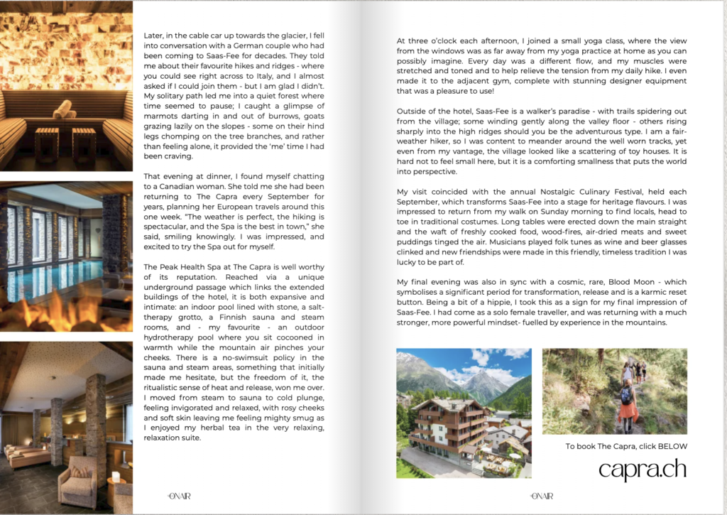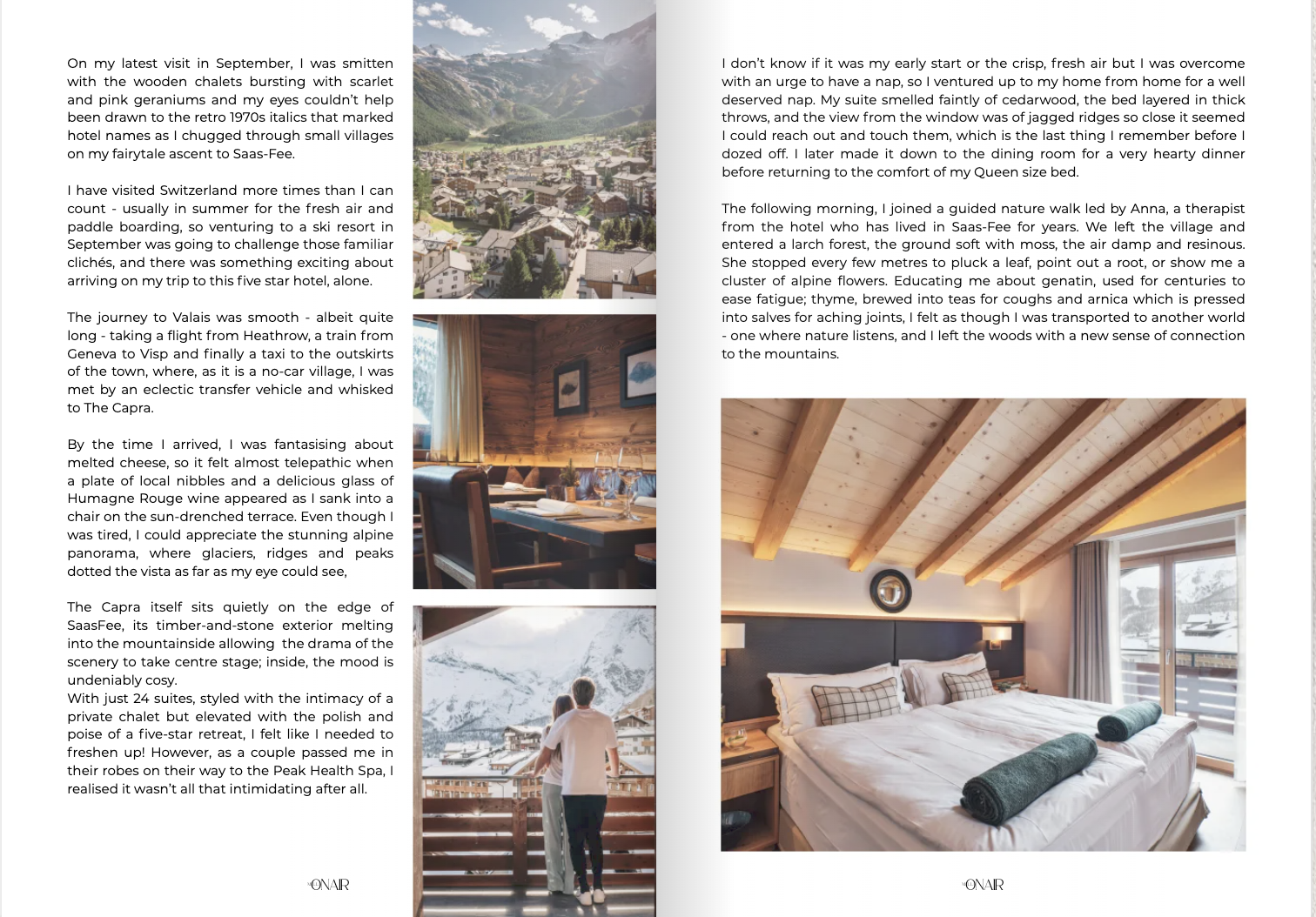 On my latest visit in September, I was smitten with the wooden chalets bursting with scarlet and pink geraniums and my eyes couldn’t help been drawn to the retro 1970s italics that marked hotel names as I chugged through small villages on my fairytale ascent to Saas-Fee.